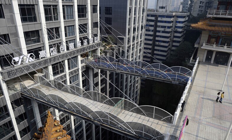 2014年12月29日,重庆解放碑附近一新建楼盘,为了出入方便,在22层高楼的外墙上,分别搭建了两个钢结构的人行天桥。天桥距离地面68米。目前这两座人行天桥方便地连接了解放碑魁星广场和滨江路,市民只要几分钟就能从解放碑直达嘉陵江滨江路。
