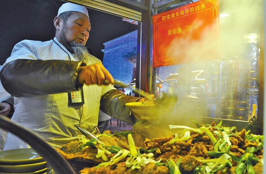 “黄焖鱼热咧,谁要黄焖鱼……”一声粗犷的吆喝声,一把花白的山羊胡,在灯火阑珊处的开封鼓楼夜市上,已年过花甲的陈建国总是会引来不少食客的目光。10月7日,记者来到陈建国家中采访。陈建国说:“真正的黄焖鱼,选用的都是黄河开封段中的野生小草鱼、小黄鱼,这是制作黄焖鱼的上等材料,只有开封这边儿才有。”这些小草鱼、小黄鱼要先油炸,炸到焦黄时,再放入每天熬制的汤当中焖,这地道的黄焖鱼就做好了。