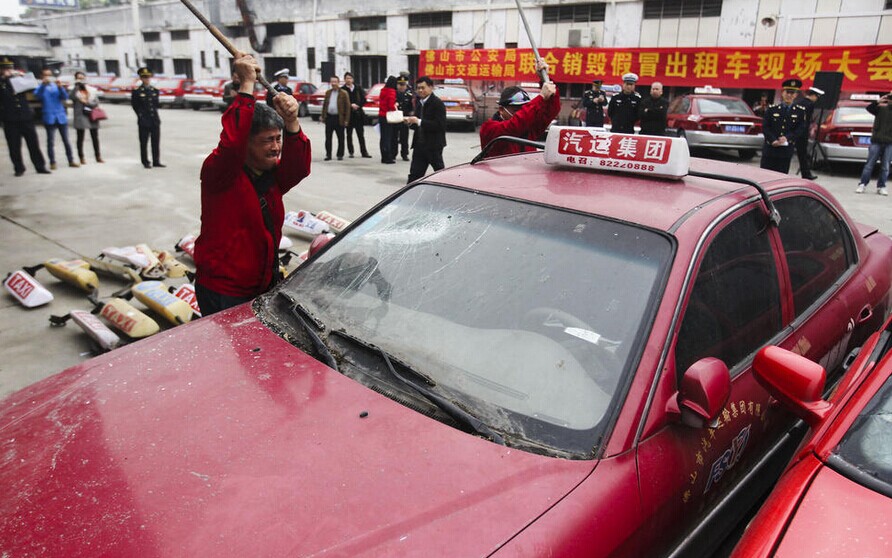 12月24日,广东省佛山市,佛山市公安局、市交通运输局在张槎一路的一个车辆保管场,联合举行销毁假冒出租车暨非法营运出租车标识销毁仪式。据统计,今年以来,佛山市共查缴假冒出租车101辆,当日集中销毁了其中的35辆。图为现场一出租车司机正用力砸烂一辆仿真度很高的违法出租车。