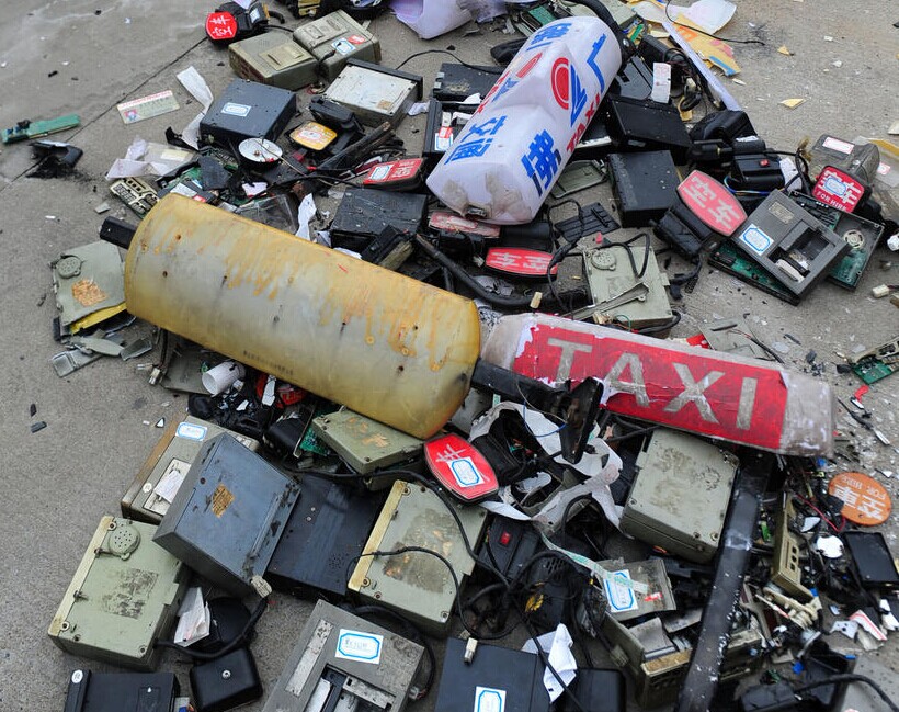 图为现场被销毁的出租车设备。