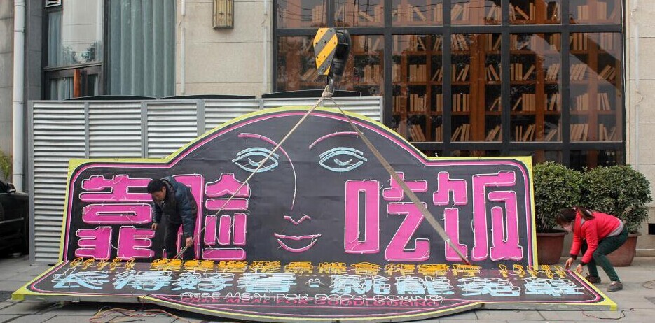 近日,郑州一餐厅因高调打出“靠脸吃饭”招牌,整形专家现场对就餐顾客容貌打分,颜值高的顾客可免费就餐活动而走火。然而,1月13日下午,该餐厅约30平方米的“靠脸吃饭”广告牌被市城管局责令自行拆除。郑州市城市管理局下发的责令改正通知书中显示,该餐厅未经批准,擅自设置户外广告行为,违反《郑州市户外广告设置管理条例》第12条规定,有碍市容容貌。不过,餐厅薛经理表示,“脸庞”虽被摘除,但“刷脸”活动将依旧进行。图为餐厅“靠脸吃饭”招牌因有碍市容市貌被拆除。